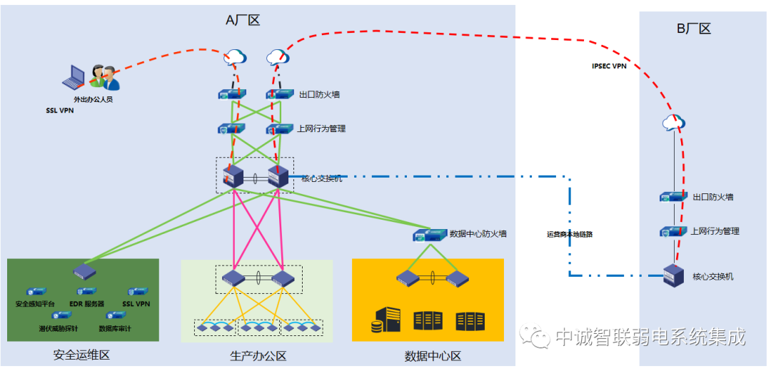 • 內網安全性:針對重要區域前端重新新增或更換下一代應用層防火墻,管網系統,提高內網核心區域的安全問題。
