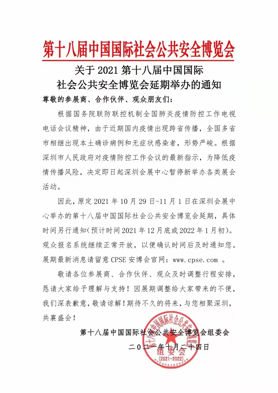 因此,原定 2021年10月29日-11月1日在深圳會(huì)展中心舉辦的第十八屆中國國際社會(huì)公共安全博覽會(huì)延期,具體時(shí)間另行通知(預(yù)計(jì)時(shí)間2021年12月底或2022年1月初)。