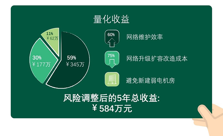 - 弱電機房投資:免取電的無源分光器取代傳統有源匯聚交換機,大幅節省機房投資,五年總收益現值超62萬元人民幣。